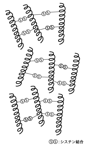 「側鎖結合」の中に「シスチン結合」という強い結合があります。この結合を切断したり再結合させることによってパーマやストレートパーマがかかります。つまりこの「シスチン結合」が弱かったり少なかったりするとパーマがかからなかったり、すぐにダレてしまうのです。
